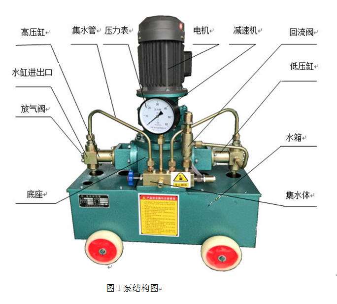 電機與減速機直連,立式固定在底座上,兩個液力缸對置安裝在底座兩側,一同固定到水箱上,水箱下部裝有四個輪子,供移動使用。底座上裝有集水體,通過集水管與兩缸連通。集水體上部裝有壓力表,以示壓力。為防止泵的脈動壓力影響表的讀視,下部設有阻尼裝置。