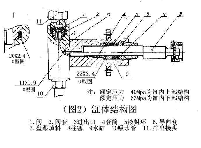 液力缸(見圖2)是試壓泵的關鍵部件,它由柱塞副和閥系兩大部分組成,其中柱塞與填料、導向套、套筒(額定壓力小于或等于40Mpa泵不設套筒);閥與閥套為關鍵零件和易損件,它們?yōu)橄嗷ヅ浜系呐技?/span>