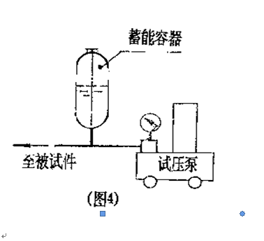 2、將被試容器與試壓泵的排出口連接起來,大中型壓力容器(容積>10L),在試驗前先用清水灌滿被試容器,或采用單向閥借助自來水自動灌水(如圖3),微小型壓力容器(容積<4L)試驗應配置蓄能容器。(見圖4)。