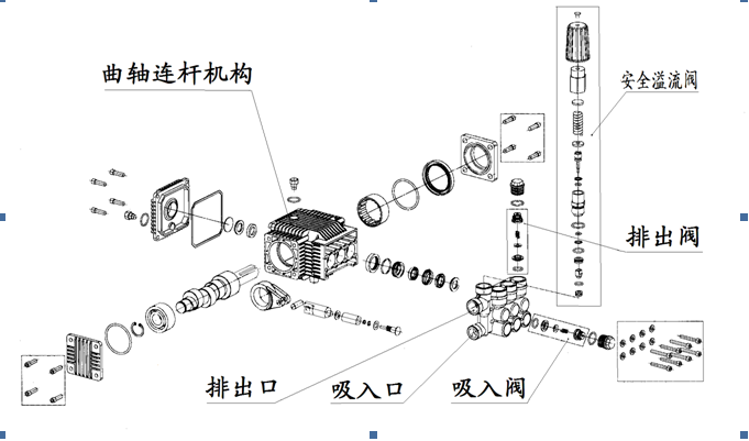 該電動(dòng)試壓泵泵頭采用臥式陶瓷三柱塞泵型式,由三相電機(jī)通過(guò)3V皮帶減速,帶動(dòng)曲軸連桿機(jī)構(gòu),將旋轉(zhuǎn)運(yùn)動(dòng)轉(zhuǎn)換為往復(fù)運(yùn)動(dòng),并推動(dòng)柱塞在液缸內(nèi)工作。這樣,工作介質(zhì)通過(guò)吸入、排出閥,形成高壓液體排出。