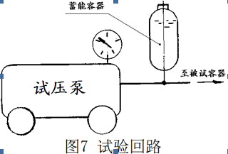 2、用高壓管將被試容器與泵的排出口連接起來,大型壓力容器(容積>10L~20L),在試驗前先用試驗介質(zhì)灌滿,小型壓力容器,為了利于保壓,最好在試驗回路中配置一個足夠容量的(不小于4L)蓄能容器。如(圖7)。